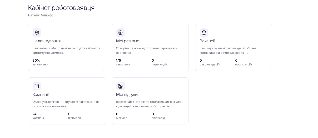 Далі по функціоналу кожного з кабінетів. Роботовзявці можуть створити власне резюме на певну посаду, вказавши свої навички, освіту, знання мов, додавши рекомендації та, звісно, посилання на портфоліо (якщо таке є). Резюме можна зробити декілька, на різні посади. Також ви додаєте свої контактні дані — від телефону до посилань на соціальні мережі.