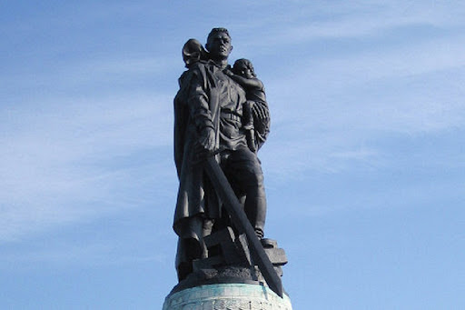 Центральним елементом композиції берлінського меморіалу стала знаменита бронзова статуя «Воїн-визволитель». Скульптуру відкрито спеціально 8 травня 1949 року, у четверту річницю Перемоги. Її вид відомий всім — солдат правою рукою тримає дівчинку, лівою рукою величезний меч, схильний донизу. Під ногами солдата – зламана свастика. Весь комплекс покликаний символізувати визвольну місію радянських військ та перемогу над фашизмом.